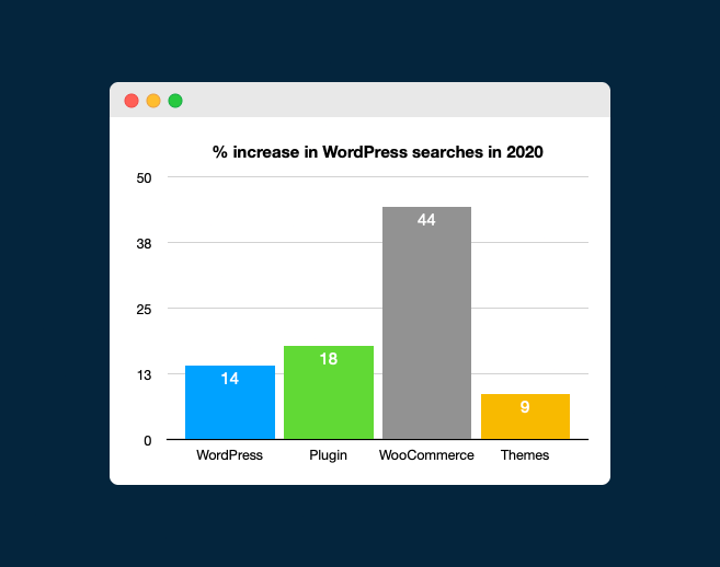 WooCommerce 建立在 WordPress 之上,全球 65% 的網站都在其上運行,WooCommerce 具有一些特殊功能,使其對像您這樣的用戶更具吸引力——尤其是願意開設在線商店的中小型企業家,以及那些誰是獨立企業家。 事實上,自大流行以來電子商務的繁榮預示著 WooCommerce 的某種革命。 WooCommerce 關鍵字的搜索量增長了 44.30%,甚至比 WordPress 關鍵字搜索的整體增長速度高出 3 倍以上。 隨著越來越多的人轉向自力更生的創業精神或在可擴展性和削減成本之間游刃有餘,這勢必會發生。