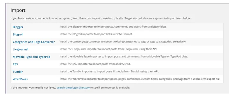例如,如果您要從 Blogger 平台遷移到 WordPress,則需要從導入選項中選擇“Blogger”。 然後它將安裝一個插件,您可以開始將內容從您的 Blogger 站點導入到 WordPress 站點。
