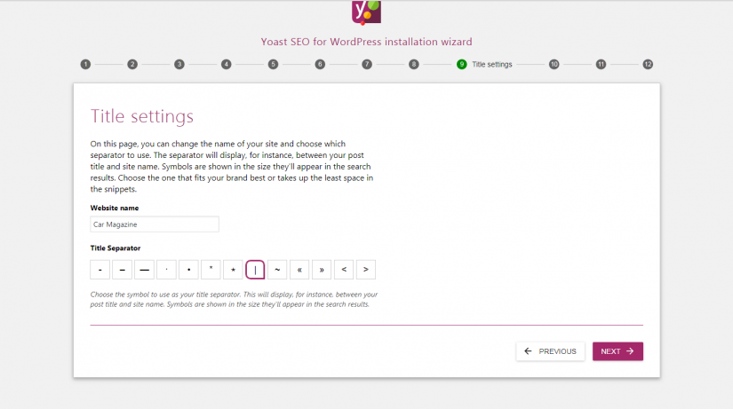 第 9 步。選擇標題分隔符 - 將頁面標題與站點名稱分開的符號: