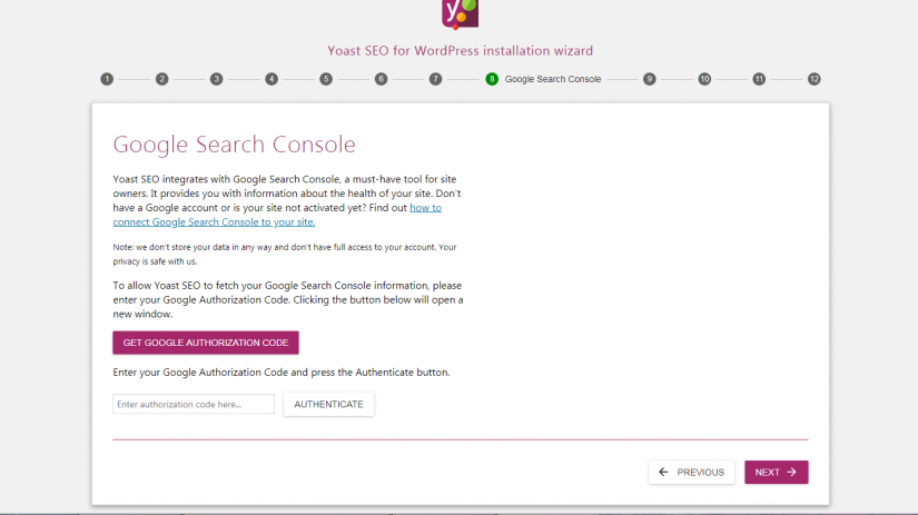 第 8 步:使用 Google Search Console 進行身份驗證。 如果您已經在 Google 控制台中擁有一個帳戶,則可以將其與 Yoast SEO 插件同步。 只需單擊“驗證”並確認操作。