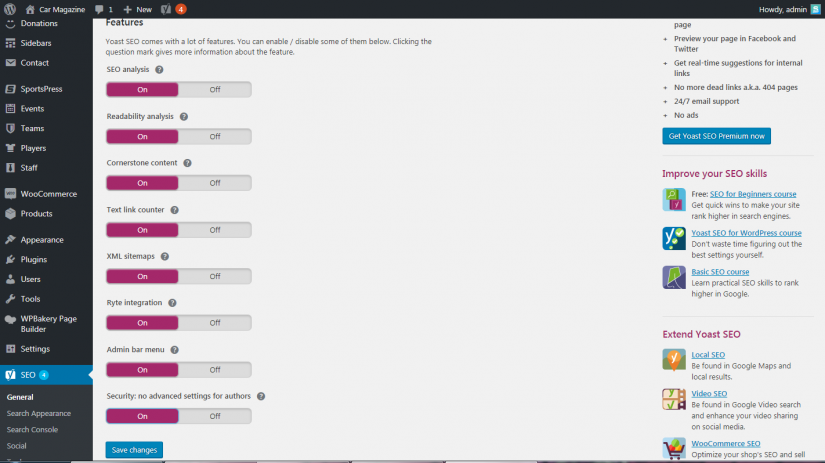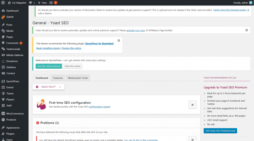 在最新版本的 Yoast SEO 中,標題、元數據和站點地圖等功能都包含在高級設置模式中。 默認情況下,它們被禁用。 在屏幕截圖中,您可以在左側面板中看到,根據 Yoast SEO 版本,僅顯示 Dashboard、Search Console 和 Go Premium。 要查看其他選項,您需要通過單擊頂部的“功能”選項卡來啟用高級模式。 在此之前,讓我們談談 Yoast SEO 插件中包含的一個新配置器,它簡化了基本配置過程。